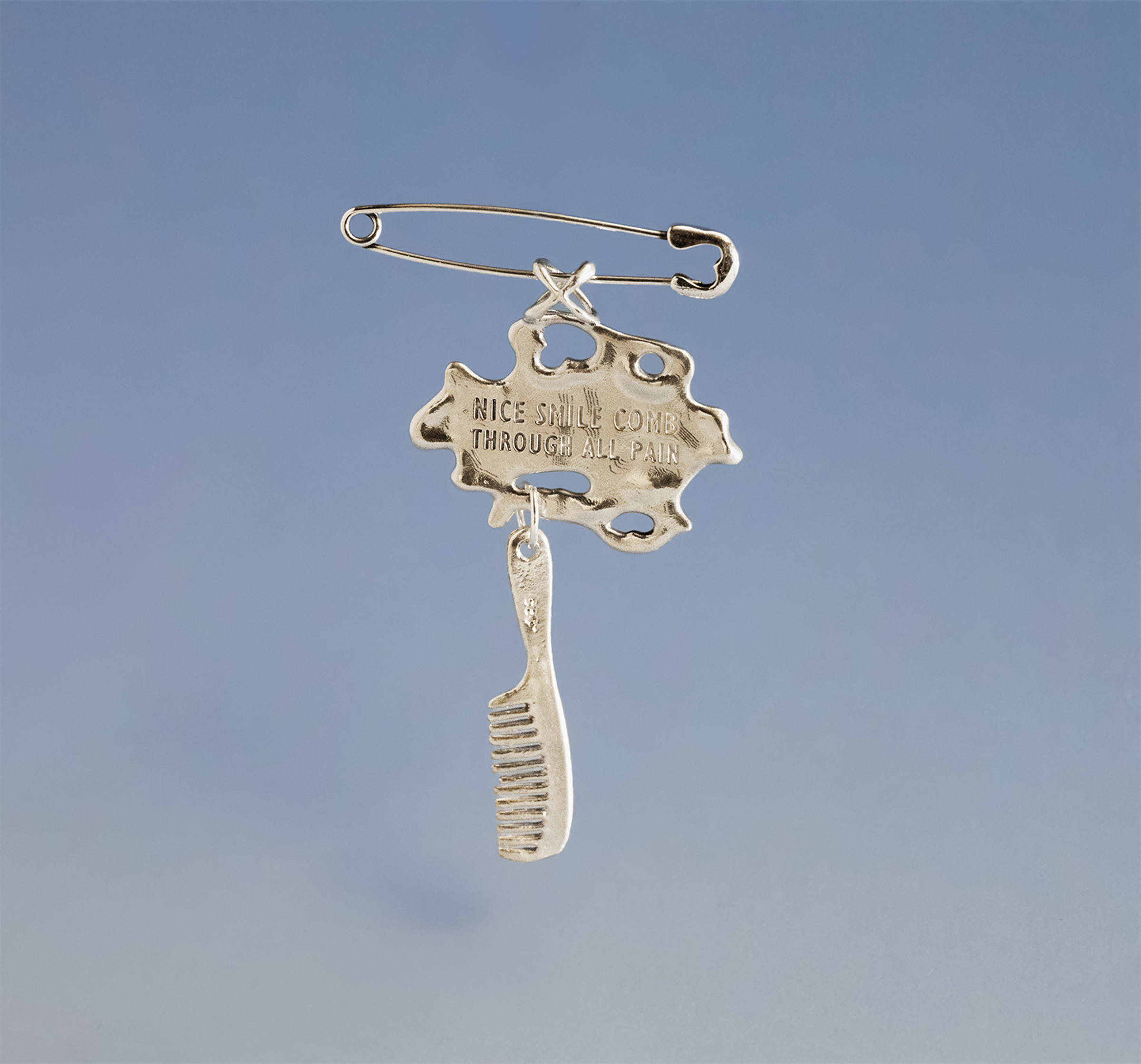 Engraved micro poem on a pin and handmade mini comb. Inspired by the surreal, broken-English phrases you often see on commercial products abroad “Bliss speak”.